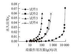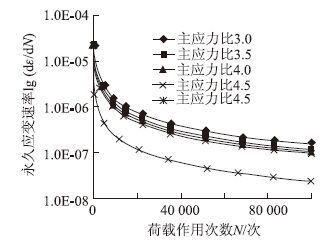 | 图 4 应变速率与荷载作用次数关系曲线(半对数坐标) Fig. 4 Curves of relation between strain rate and loading times (semi-logarithmic scale) |