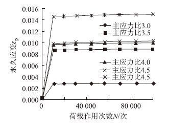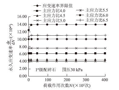 由图 5看出,在围压30 kPa和加载主应力比分别为6.5和6.0时,1#级配碎石的永久应变速率均已超过了1×10-8,即粒料的永久变形已经由A区(塑性安定状态)发展到了B区(塑性蠕变状态),此种状况不符合在A区内建立粒料基层永久变形控制模型的原则,予以舍弃;当主应力比小于6.0时,各种加载路径下的永久应变速率即使在荷载作用次数达到4 000万次的时候,仍然小于1×10-8,粒料的永久变形始终处于A区(塑性安定状态)内,由此判断A区向B区过渡时的临界主应力比为6.0。因此,只有当主应力比小于等于5.5时,粒料的永久变形才处于塑性安定状态,即A区内。