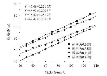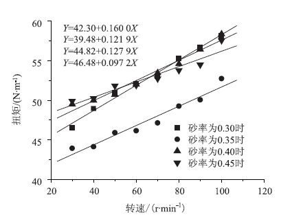| 图 2 不同砂率的粗粒式混凝土转速与扭矩的关系 Fig. 2 Relationship between rotational speed and torque of coarse grained concrete with different sand ratios |