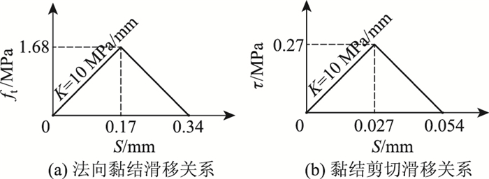 新老混凝土结合面的黏结滑移关系是进行有限元模拟的重要依据,主要包括黏结滑移曲线的类型、结合面上两个方向的剪切强度τx和τy、结合面法向轴拉强度ft、结合面黏结滑移刚度K和最终的滑移值与峰值应力对应滑移值Su/So。