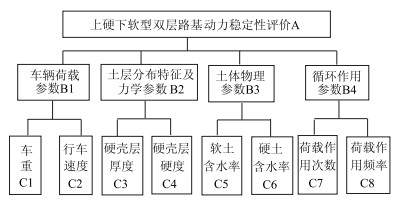 2 模型构建与计算处理 2.1 层次模型的建立根据上硬下软型双层路基的工程特点,将车辆荷载参数、土层分布特征及力学参数、土的物理参数以及循环作用参数4个方面入手,将这4个方面作为层次结构的准则层。