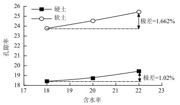 | 图 5 不同含水率硬、软土的孔隙率比对曲线(单位:%) Fig. 5 Comparison curve of void ratio of hard and soft soil with different moisture contents (unit:%) |