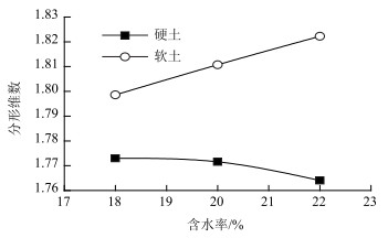 | 图 6 不同含水率硬、软土分形维数比对曲线 Fig. 6 Comparison curve of fractal dimension of hard and soft soil with different moisture contents |