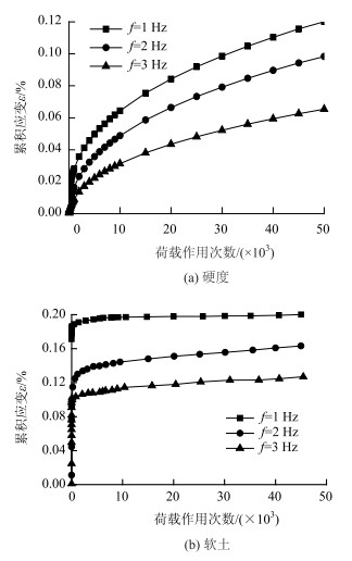 | 图 8 不同频率硬土和软土累积变形 Fig. 8 Cumulative deformation of hard soil and soft soil at different loading frequencies |