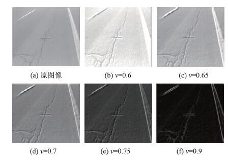 第1组试验是对lf1图像进行增强,试验结果如图 1所示。其中,图 1(a)为原图像,图 1(b)~(f)是新模型取不同的阶数值v得到的路面图像增强结果。由试验结果可知,当0<v<0.7时,试验效果随着阶数v的增加而逐渐变好;当v>0.7时,效果随阶数的增加而逐渐变差。整个试验随着v值的增大灰度逐渐变小,当v=0.65时,增强后的图像灰度值与原图像最接近,因此效果相对较好。