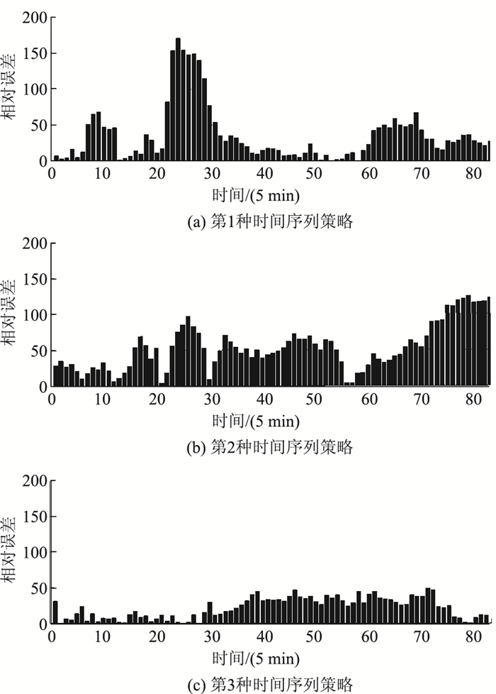 模型不同时间序列预测结果相对误差如图 6所示,其中第1种策略相对误差在采样点20~30时间段内误差较大,而在40~60之间较小,造成相对误差较大的原因主要是训练样本集在20~30时间段内交通流量不稳定;第2种策略总体相对误差都较大,原因主要为每天交通流量存在一定差异,训练得到的参数不适合后一天交通流量的预测;第3种策略在0~30时间段内相对误差较小,预测精度较高,在35~70时间段内相对误差较大,其中在40~60之间相对误差大于第1种模型,但总体预测精度优于其他两种,原因在于当天半小时内交通流量变化较小,能够较好地训练而得到预测参数。