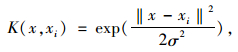 式中, α=[α1, …,αi, …,αm]和α*=[α1*, …,αi*, …,αm*](i=1, 2,…, m)为拉格朗日算子; m为支持向量个数; e=[1, …,1]T; K(x, xi)为核函数,它接受低维空间的输入值xi,能算出高维空间的内积值。