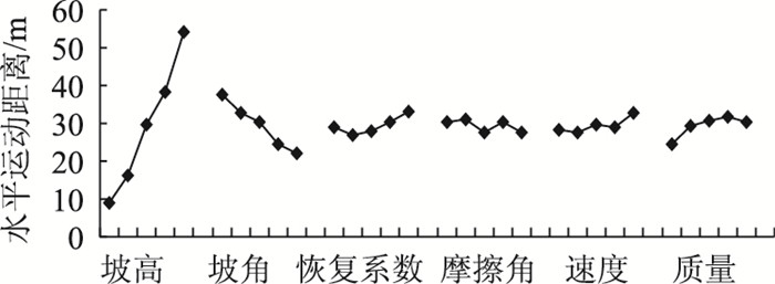 4 结论(1) 采用正交试验法,以落石运动的水平运动距离、落石的弹跳高度和落石运动能量为研究对象,可以分别得到各运动特征参数影响因素的敏感性排序和影响规律,并确定落石运动特征参数的较不利 (或较优) 因素水平组合。