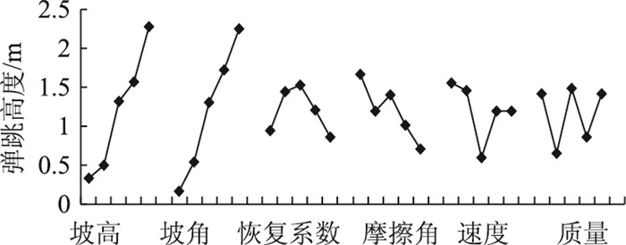 (2) 对于落石弹跳高度影响因素的敏感性排序依次为:坡角、坡高、初始速度、质量、摩擦角和边坡恢复系数。落石弹跳高度的较不利组合为:边坡坡高取35 m;坡角61°;摩擦角19°;切向恢复系数0.85;初始速度0.5 m/s;质量2 kg。