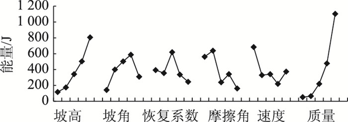 (3) 对于落石运动能量而言,其影响因素的敏感性排序依次为:落石质量、坡高、摩擦角、初始速度、坡角和边坡恢复系数。落石运动能量的较不利组合关系为:质量取2 kg;边坡坡高35 m;摩擦角22°;初始速度0.5 m/s;坡角53°;切向恢复系数0.85。