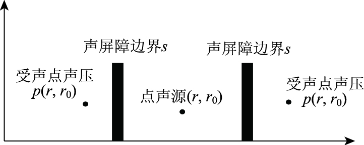结合反映声源与声场之间关系的Helmholtz方程对无声屏障时声场中的声压进行计算,采用Green函数法对Helmholtz方程进行求解,Green函数表示任意点声源在自由场空间中任意点产生的声压为: