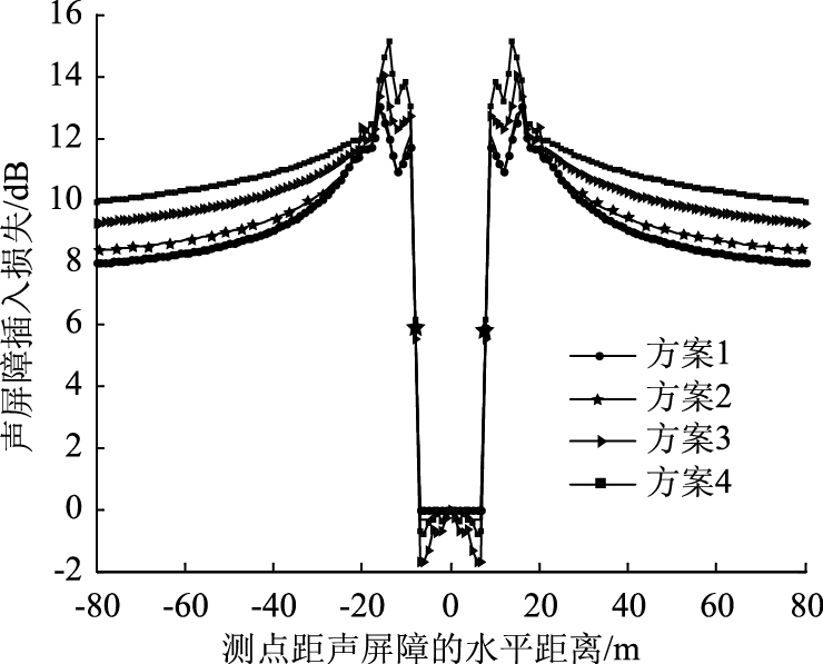 复合型声屏障因其组合形式不同,在远声源侧和近声源侧的声场分布有差异。在近声源侧,复合型声屏障因隔声屏障的高度和面积不同,其声屏障插入损失不同。在近声源侧,当隔声屏障与受声点的相对高度越小,干涉现象越明显,声屏障插入损失负值越大;当隔声屏障面积越大,声屏障插入损失负值也越大。故方案2的声屏障插入损失负值最大,方案3声屏障插入损失负值最小。在远声源侧干涉阶段,方案4干涉加强区和减弱区的声屏障插入损失最大,这是因为方案4比方案3与方案2能更有效地减弱声屏障的绕射。在远声源侧稳定阶段,复合型声屏障的降噪效果优于吸声型声屏障,方案2的插入损失比方案1高0.4 dB,方案3的插入损失比方案1高1.3 dB,方案4的插入损失比方案1高2 dB。