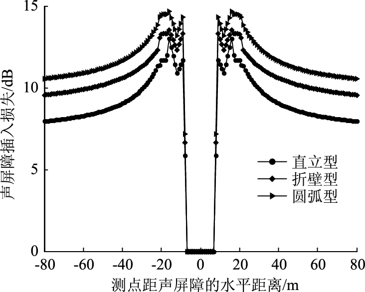 (5) 顶端结构的变化不会影响声屏障插入损失随受声点水平距离的变化规律,顶端结构为圆弧形声屏障的降噪效果优于30°折壁型和直壁型。