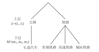 从图 1可以看出,本文构建的NL模型有两层结构,其中,上层结构为公路和铁路两种运输方式。由于本文没有考虑私人小汽车的城际出行,因此在公路运输方式l1的下层结构中只考虑了长途汽车,而铁路运输方式l2的下层结构中考虑了常规铁路、高速铁路和城际铁路。