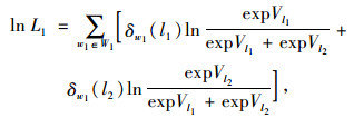 式中,L1为样本的似然函数;W1为样本容量;Pw1(l1) 和Pw1(l2) 分别为个体w1选取运输方式l1和l2的概率;δw1(l1) 为0-1变量,其取值原则为当个体w1选取的方案是l1时,δw1(l1) 取1,而当个体w1选取的方案不是l1时,δw1(l1) 取0;δw1(l2) 为0-1变量,其取值原则与δw1(l1) 的取值原则相同。