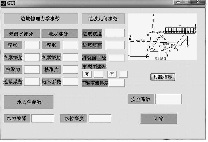 2 计算程序从浸水路基边坡的稳定性分析方法的推导过程可以看出,在求解安全系数时需进行大量的运算,为了方便工程应用,开发了浸水路基的稳定性分析程序,并将其嵌入界面模块,如图 3所示。用户在使用时只需在图 3所示的界面中输入相应的参数,点击“计算”,便会输出对应的安全系数,计算过程均在后台完成,具体计算流程见图 4。