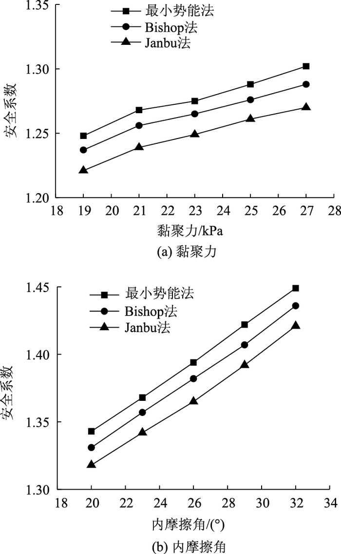 从图 7可以看出:随着黏聚力、内摩擦角增加,浸水路基边坡的安全系数在逐渐增大,说明路基的稳定性在提高,与工程实际相吻合;文中方法所得结果与其他两种极限平衡法相近,相差在5%以内,且变化规律一致,进一步验证了文中方法的合理性。