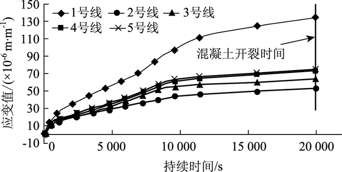 从图 7中可以看出,当试件从烘箱中拿出来那一刻,混凝土中就迅速累积了拉应变,随着时间的增长趋势有所放缓,但仍在持续增大,当1号位应变达到134×10-6 m/m时,混凝土开裂,体系累积的应力释放,混凝土在整个过程中的最大拉应力为3.37 MPa。