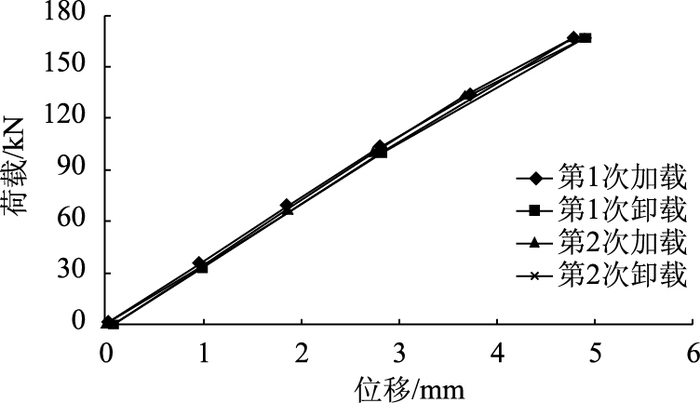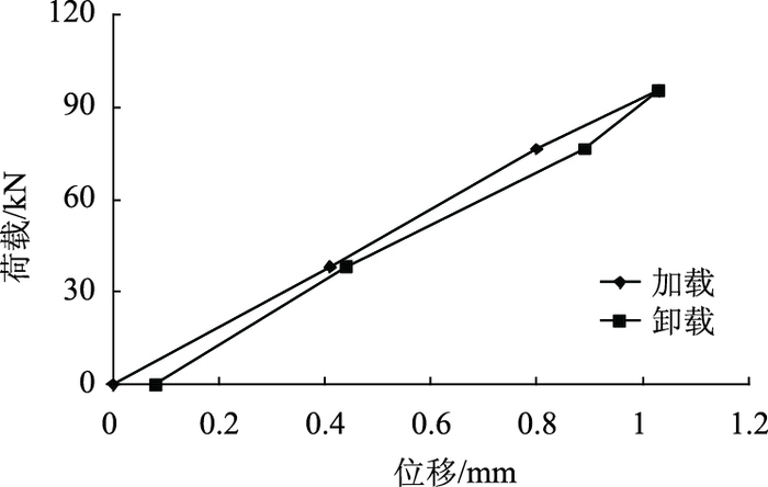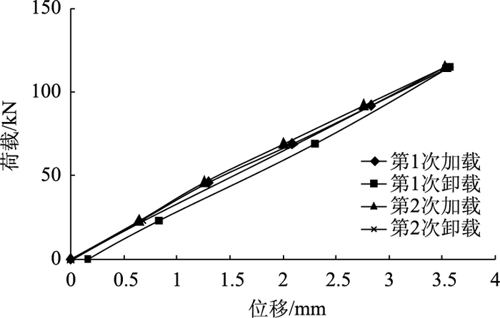 悬臂端荷载位移曲线见图 12。由试验数据可反算加固模型梁的实际抗弯刚度为4 179.76×106 N·m2,与加固前横向弯曲刚度3 202.7×106 N·m2对比增加33.1%,与未受损梁初始弯曲刚度对比相差-5.73%。由于横向抗弯刚度比竖向弯曲刚度大得多,而施加的荷载较小,横向限位装置在实验室很难完全限位,导致刚体位移较大,故试验数据存在一定误差。