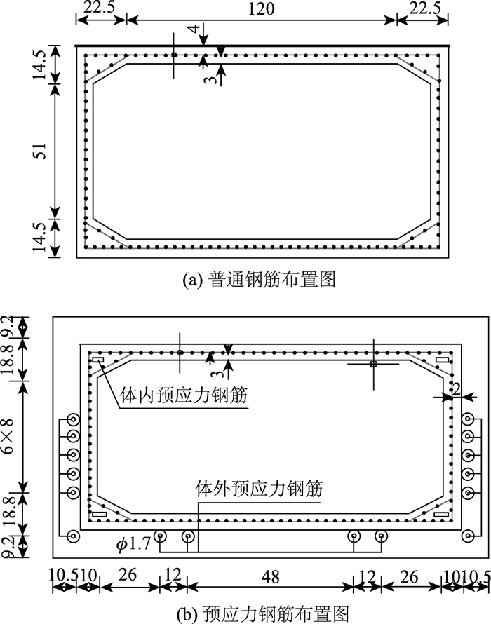 1 钢筋混凝土箱梁加固试验 1.1 试验模型该特大斜拉桥主梁强受扭损伤后,主要加固方案为:对裂缝进行化学灌浆处理,依靠粘结剂的粘结力将结构内部组织尽可能地结合为整体,使其恢复应有强度;腹板锚贴钢板及优化桥面铺装,将受损梁段原10 cm厚铺装层优化为5 cm厚UHPC超高性能混凝土和5 cm厚沥青铺装层。为了研究该加固方案的可行性,开展了钢筋混凝土箱梁的加固试验研究。采用实桥中箱室截面相似比1:4作为模型梁的截面形式,模拟4段梁的长度,模拟实桥损伤后(模型梁大部分裂缝宽度为0.2 mm,裂缝间距为10 cm左右,裂缝夹角绝大部分为45°左右),试验梁依据实桥加固方案等效加固处理,模型梁立面图见图 1,普通钢筋及预应力筋布置图见图 2(体外预应力模拟斜拉索水平分力)。
