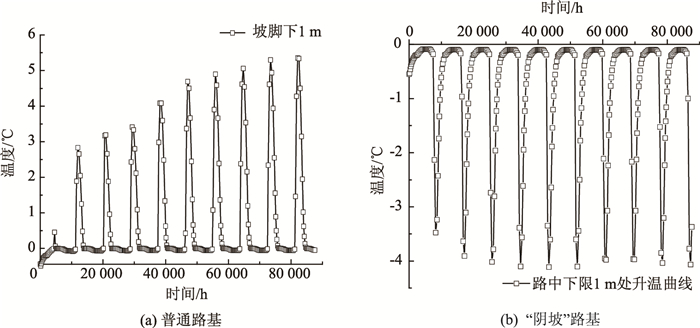 由图 10~图 12可知:普通路基工况下,路基坡脚处温度呈周期性上升趋势,10 a内,温度普遍上升2~3 ℃,而“阴阳坡”路基阴坡侧由于温度较低,10 a内温度普遍下降0.3~0.8 ℃;路基高度越高,坡脚1 m处第10年温度峰值越低,以普通路基为例,5,10,15 m路基坡脚温度峰值分别为6.42,5.35,4.28 ℃,同比下降16.7%,33.3%;“阴阳坡”路基,阴坡侧温度峰值分别为:-3.66,-4.07,-4.67 ℃,同比下降:11.2%, 27.6%。在多年冻土地区路基选择和修筑时,应充分考虑温度场变化对路基及底部多年冻土的影响,填方路基高度要有合理控制区间,随着“阴阳坡”效应对路基稳定性的影响,要做好路基阳坡面的防护措施,减少外界热量向路基内部以及底部多年冻土侵入。