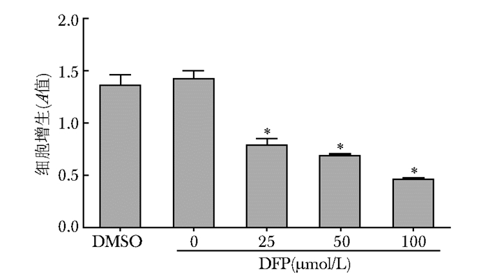 结果 细胞增生检测结果随着DFP干预浓度的增加,A值逐渐降低。DMSO溶剂组、对照组 (0 μmol/L) 和DFP 25、50、100 μmol/L组A值分别为1.36±1.10、1.41±0.09、0.78±0.06、0.68±0.03、0.46±0.01。DFP各浓度组与对照组 (0 μmol/L) 比较,差异有统计学意义 (P < 0.05)(图 1)。