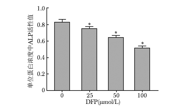 随着DFP干预浓度的增加,ALP活性指标逐渐降低。对照组 (0 μmol/L) 和DFP 25、50、100 μmol/L组ALP活性值分别为0.83±0.05、0.75±0.04、0.64±0.03、0.51±0.03。DFP各浓度组与对照组 (0 μmol/L) 比较,差异有统计学意义 (P < 0.05)(图 2)。