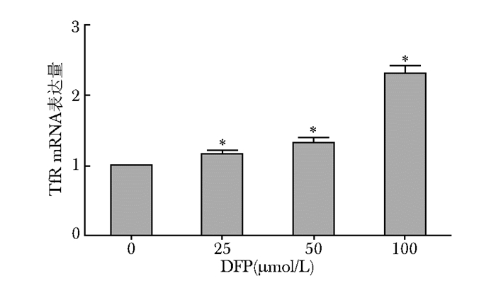 随着DFP干预浓度的增加,TfR mRNA表达量逐渐升高。对照组 (0 μmol/L) 和DFP 25、50、100 μmol/L组表达比分别为1、1.16±0.05、1.32±0.06、2.30±0.11。DFP各浓度组与对照组 (0 μmol/L) 比较,差异有统计学意义 (P < 0.05)(图 3)。