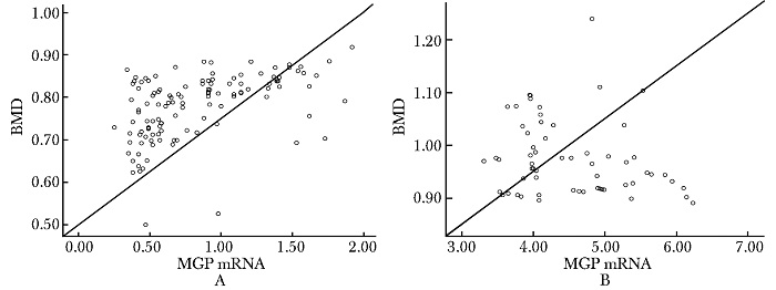 | 图 1 两组患者MGP mRNA含量与BMD的相关性 Fig.1 Correlation of MGP mRNA and BMD between two groups A:绝经后骨质疏松患者(r=0.376,P=0.000);B:健康对照组(r=-0.181,P=0.167); MGP:血清基质Gla蛋白;BMD:骨密度 |