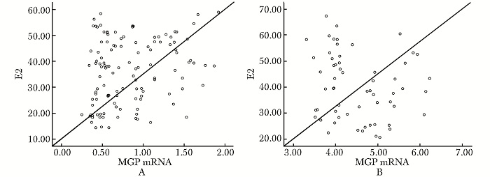 | 图 2 两组患者MGP mRNA含量与E2的相关性 Fig.2 Correlation of MGP mRNA and E2 between two groups A:绝经后骨质疏松患者(r=0.227,P=0.013);B:健康对照组(r=-0.179,P=0.170); MGP:血清基质Gla蛋白; E2:血清雌二醇 |