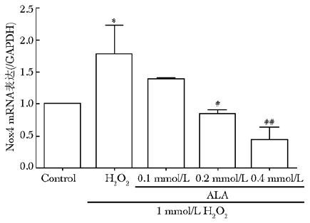 图5 硫辛酸对Nox4 mRNA表达水平的影响 Fig.5 Effect of ALA on the expression level of Nox4 mRNA ALA:硫辛酸; 与空白对照组比较,*P<0.01;与H2O2组比较,#P<0.05,##P<0.01; |