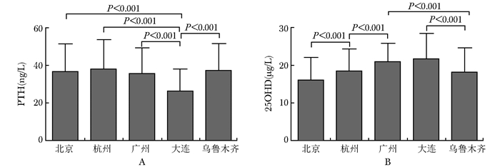 | 图 1 不同地域血清PTH水平及25OHD比较 Figure 1 Serum levels of PTH and 25OHD in different cities PTH:甲状旁腺素;25OHD:25羟维生素D |