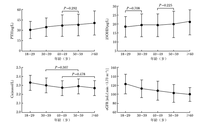 随着年龄的增加,血清PTH水平增加(P<0.01),但40~49岁组与50~59岁组间差异无统计学意义(P=0.292)(图 2)。血清25OHD水平也随年龄增加而增加(P<0.01),但18~29岁组与30~39岁组间及40~49岁组与50~59岁组间比较,差异无统计学意义(P值分别为0.708,0.225)。随着年龄的增加,血清Ca水平降低(P<0.01),但30~39岁组与50~59岁组间及40~49岁组与≥60岁组间比较,差异无统计学意义(P值分别为0.307,0.478)。估算肾小球滤过率(estimated glomerular filtration rate,eGFR)随着年龄增加而显著降低(P<0.01)(图 2)。血清P水平在各年龄组比较,差异无统计学意义(P>0.05)。