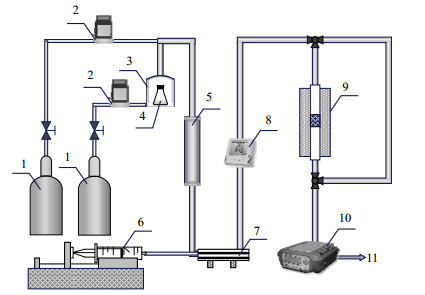 图 1 VOCs与水蒸气竞争吸附实验装置示意图 Fig.1 Schematic diagram of the experimental setup for VOCs and water vapor competitive adsorption 1. N2 2. flowmeter 3. thermostat 4. liquid VOCs 5. static mixer 6. microinjector 7. heater 8. temperature and humidity transmitter 9. tube furnace 10. PF300 11. tail gas purification and discharge |