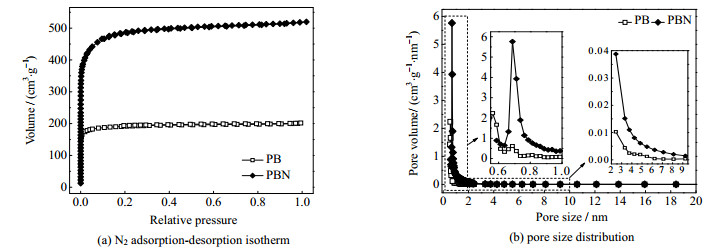 3 结果与讨论 3.1 表征结果图 2(a)和(b)为开心果壳基生物炭的氮掺杂前后的N2吸附-脱附等温线和孔径分布图,图 2(a)纵坐标为每克吸附剂吸附的体积。从图中可以看出,2种生物炭的吸附和脱附曲线重合,不存在滞后环,根据IUPAC分类,PB和PBN的N2吸附脱附曲线属于I型物理吸附等温线[13]。在相对压力较低的范围内,N2吸附量迅速增加,表明2种生物炭具有微孔结构。随后,等温线出现水平或接近水平平台表面,此时微孔被充填,几乎没有进一步吸附。从图 2(b)中能明显看出,2种生物炭材料均具有丰富的微孔结构和超微孔结构(孔径小于0.7 nm),其中PB拥有更广的微孔孔径分布。PBN含有一定的中孔结构,其含量高于PB。表 1中列出了测得的孔径结构参数:比表面积SBET、微孔的比表面积Smic、总孔容Vtot、微孔体积Vmic、微孔率Vmic/Vtot、平均孔径DB。PB的SBET、Smic、DB均小于PBN。