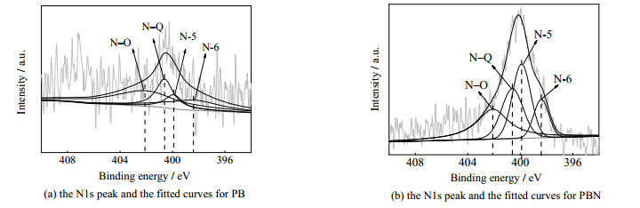 图 3为生物炭的XPS N1s的精细谱,其表面的化学成分含量(质量分数wB)统计于表 2。图 3中,PBN的N1s峰型较PB更高、更陡峭,二者的N1s峰均可分为4个峰,说明样品表面存在吡啶氮(N-6,398.4 eV)、吡咯氮(N-5,399.9 eV)、石墨氮(N-Q,400.6 eV)和氧化氮(N-O,402.1 eV)[12]。氮掺杂增加了生物质表面氮含量,N-5含量有明显的提高。