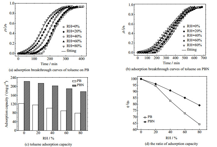 (2) 在相对湿度为80%下,PBN和PB吸附低质量浓度(ρ0 = 110 mg⋅m−3)甲苯的容量分别为初始吸附量(223.56和123.01 mg⋅g−1)的79.2 % 和64.2 %,PBN的疏水效果强于PB。
