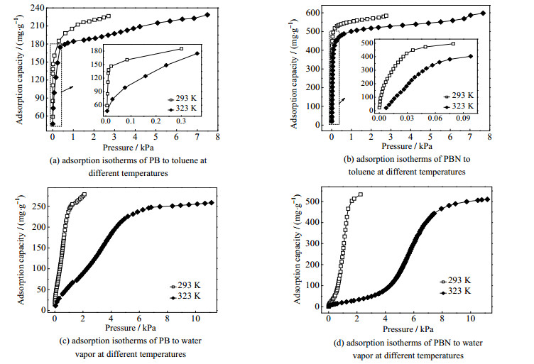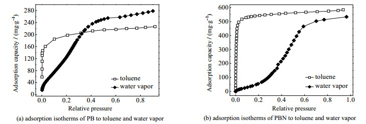 图 5 K下PB和PBN对甲苯以及水蒸气的等温吸附线 Fig.5 Toluene and water vapor adsorption isotherms of PB and PBN at 293 K |