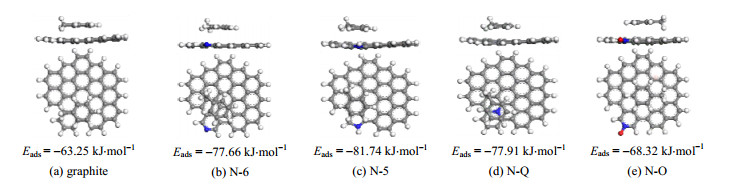 图 7 含氮基团对甲苯吸附的优化几何构型及吸附能 Fig.7 Optimal geometric configuration and adsorption energy of nitrogen-containing groups for toluene adsorption |