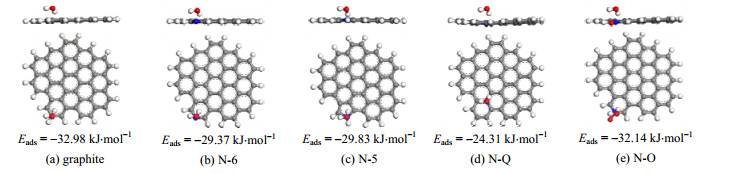 图 8 含氮基团对水分子吸附的优化几何构型及吸附能 Fig.8 Optimal geometric configuration and adsorption energy of nitrogen-containing groups for water vapor adsorption |