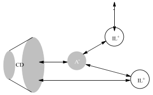 图 1 手性离子液体阳离子(IL+)、环糊精(CD)、洛芬类对映体阴离子(A-)相互作用机理简图[24] Fig.1 Mechanism of interaction among chiral ionic liquids, β-CD and anionic profen |