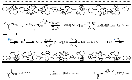 从以上研究情况可以看出,配体交换法毛细管电泳拆分中手性离子液体对于拆分的影响也主要是两方面(以[EMIM]L-Lac拆分色氨酸为例)。首先,手性离子液体在缓冲液中部分解离,解离出的咪唑阳离子基团在毛细管壁特异性地吸附,修饰管壁,引起负电荷聚集,影响电渗流强度,影响迁移时间。其次,未解离的手性离子液体与配位中心金属离子,待分离对映体通过配体交换形成三元络合物,手性离子液体中的阳离子与三元络合物通过离子对相互作用。依据不同对映体三元络合物间的迁移速率差异进行拆分,如图 2所示。由于手性离子液体分子体积较大,生成的三元络合物的稳定性差异也较大,并且以其为配体的络合物可能通过烷基长链与壁面发生疏水作用,因而表现出更好的手性拆分能力。