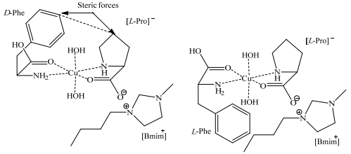 唐飞等[46]使用咪唑基的氨基酸手性离子液体同时作为溶剂与手性选择剂对多对氨基酸对映体进行了萃取拆分。研究中,溶有醋酸铜的咪唑基L-脯氨酸盐离子液体作为一相,添加了氨基酸消旋体的乙酸乙酯作为另一相。实验测定了体系对于4种氨基酸的拆分情况,并对铜离子浓度,氨基酸浓度等条件进行了优化。研究显示,此含有手性离子液体的两相体系对于氨基酸的拆分属手性配体交换机理,离子液体、Cu2+及两种对映体组成不同构型的络合物,如图 3所示。此体系应用于苯丙氨酸与酪氨酸消旋体拆分时效果较好,对映体过量值(ee%值)分别为35.8%与21.9%,对于组氨酸、色氨酸则效果不明显。