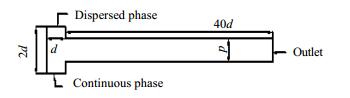 两相入口为速度入口边界条件,出口处设为压力出口边界[26]且为标准大气压。壁面为无滑移边界条件,壁面接触角为180°。分散相入口αd=1,即该处全为分散相,连续相入口αc=1即该处全为连续相。连续相先充满管道,当t=0时,两相液体同时流入管道。所用流体的物理性质如表 1。
