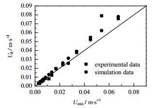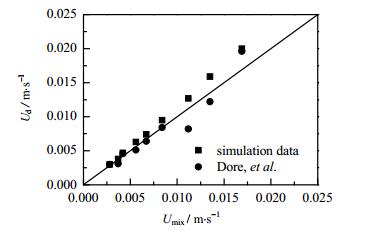 为了验证该式的准确性,将式(9)的计算值与Dore等[19]的实验值对比如图 10,实验值与式(9)计算值整体吻合很好,平均误差在17.7%左右。且液弹速度与混合速度差随混合速度的变大而增大。