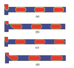 图 4为三种不同连续相流量分数下无量纲液弹长度与毛细管数(Ca)的关系,由图可知低速时,无量纲液弹长度随Ca的增大略有不同,但随Ca进一步增大趋于减小。且无量纲液弹长度随连续相流量分数的增大而减小。模拟结果与Dore等[19]的实验结果总体一致。