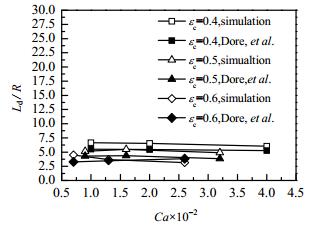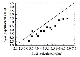 | $ \frac{{{L_\rm{d}}}}{R} = \left( {1.263 + 1.981 \times \frac{{{Q_\rm{d}}}}{{{Q_\rm{c}}}}} \right)C{a_\rm{c}}^{-0.0891} $ | (8) |