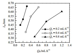 连续相流率不变,改变分散相流率,观察液弹长度变化。图 5为分散相流率对液弹长度的影响,当连续相流率为常数时,液弹长度随分散相流率的增加而变长。且由3.2.1节知,液弹长度随连续相流率增加而减小。
