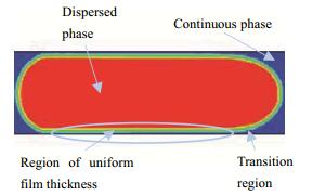 如图 7所示,在液液弹状流中,分散相液弹几乎占据了整个毛细管的横截面积,这使连续相形成薄液膜将分散相液弹与管壁分隔。分散相前端和后端为半球形,液膜沿分散相液弹长度分布不均匀,分为均匀液膜区和过渡区,本文研究均匀液膜区液膜厚度。采用FLUENT后处理软件,选取分散相体积分数为0.1的界面,即该界面处几乎全部为水相,计算液膜厚度。