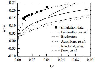(2) 液膜厚度受毛细管数的影响且随毛细管数的增大而变厚,液膜厚度与现有的关联式符合较好,平均误差大约为11%。